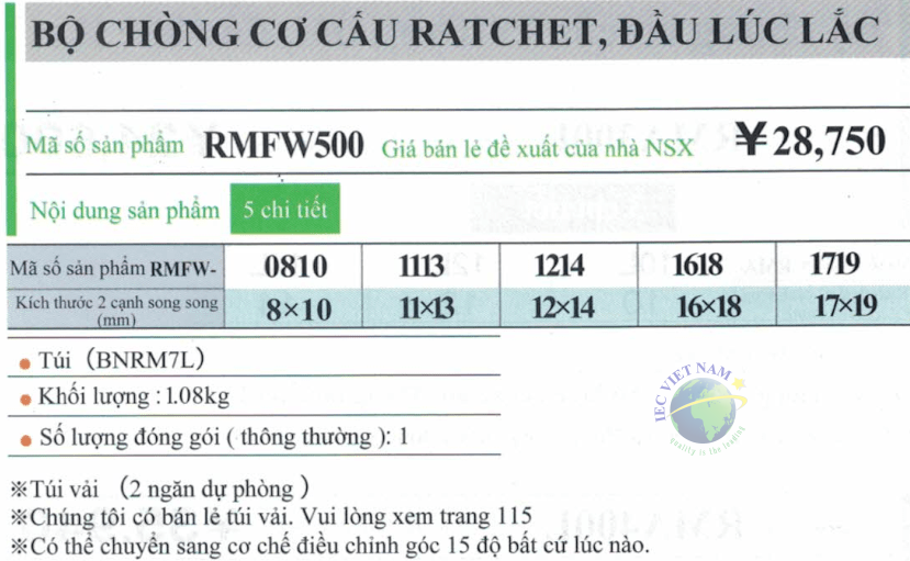 Thông số kỹ thuật bộ chòng cơ cấu Ratchet, đầu lúc lắc TONE RMFW500
