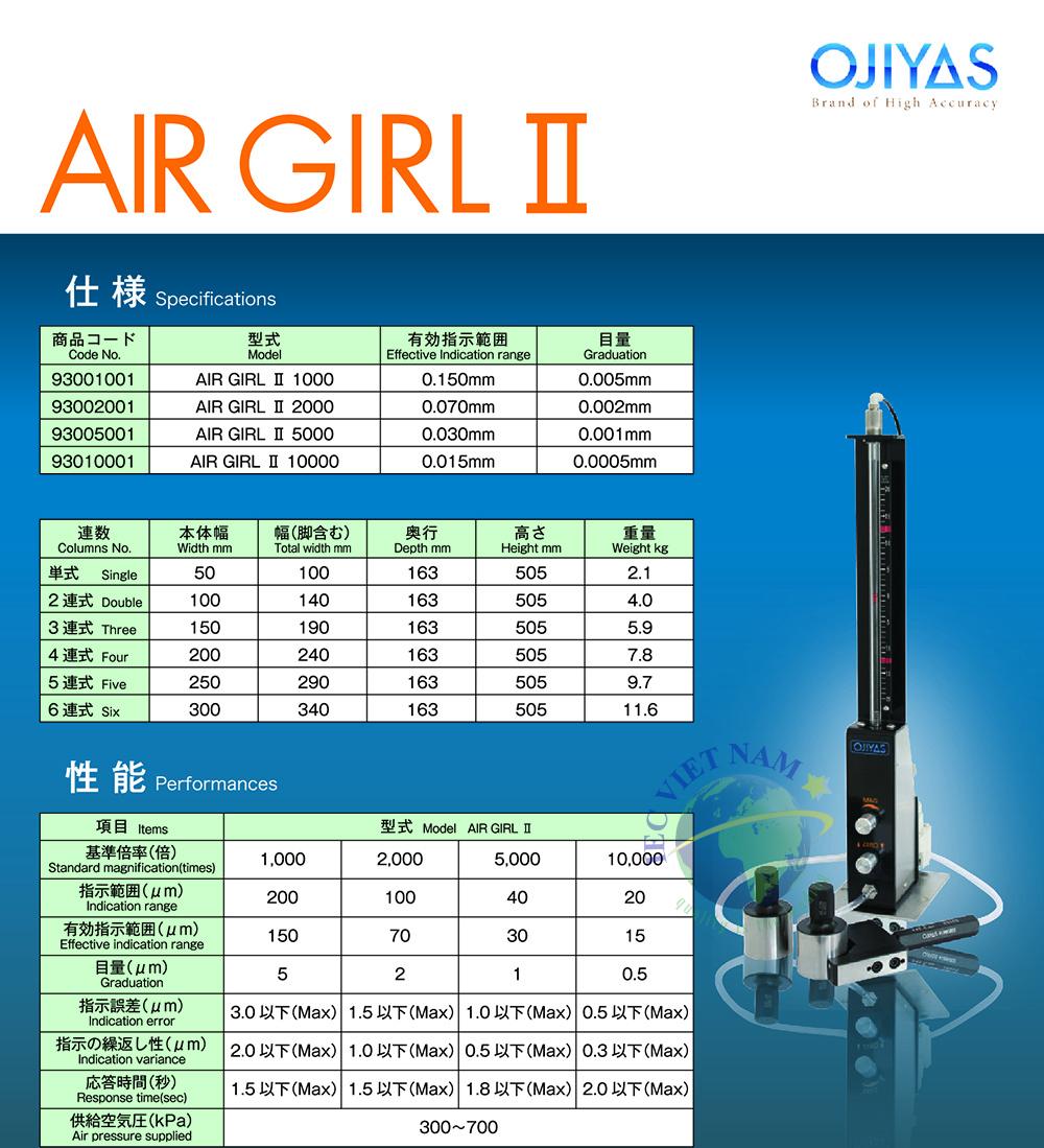 Máy đo bằng khí nén AIR GIRL II của hãng OJIYAS là một dụng cụ đo lường so sánh chính xác áp dụng nguyên tắc khí động học có thể đọc nhanh các kích thước của lỗ, trục với độ chính xác cao. Kích thước của chi tiết cần đo sẽ được thể hiện bằng phao khí chỉ báo chạy dọc theo một ống khí đứng trên thân máy.