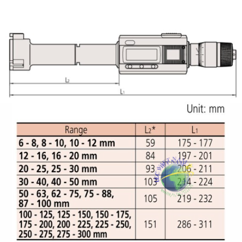 | Mã số | Phạm vi (mm) | Độ phân giải (mm) | Sai số tối đa cho phép (µm) | Thanh kéo dài (Tùy chọn) |